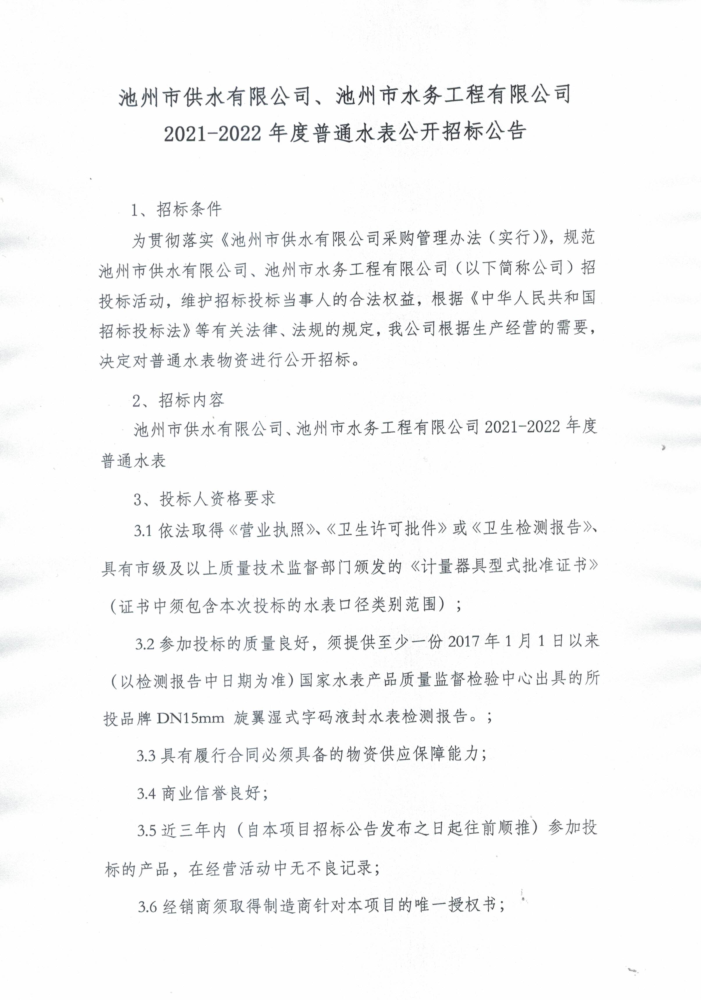 | 池州市供水有限公司、池州市水務(wù)工程有限公司2021-2022年度普通水表公開招標(biāo)公告 | |